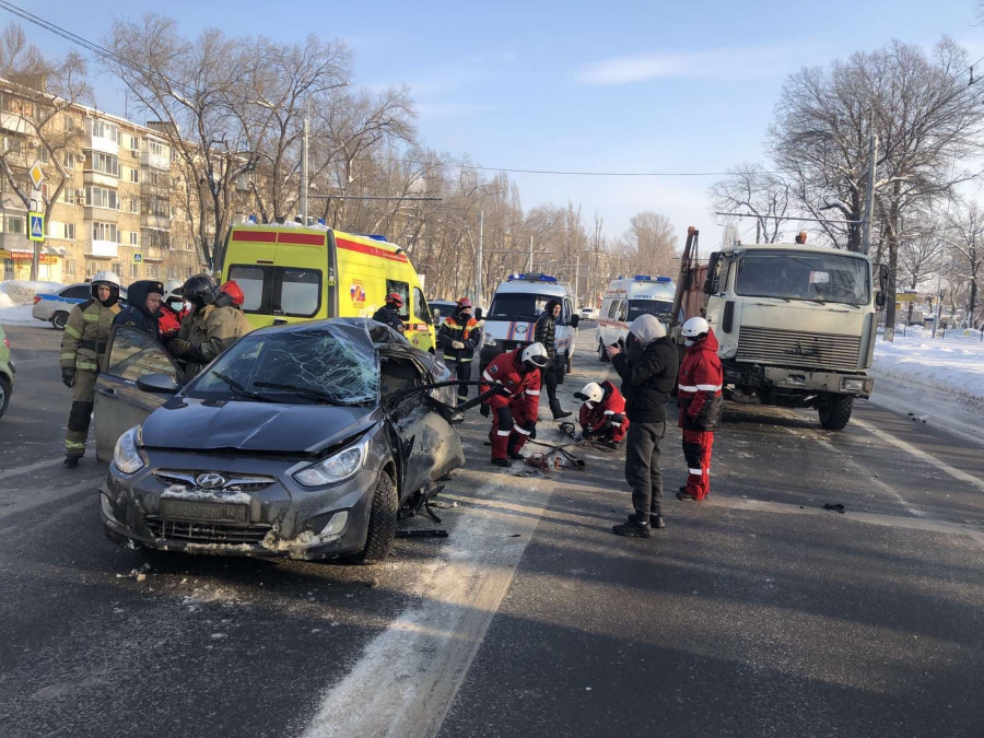 По предварительным данным, около 13.40 здесь столкнулись легковушка «Хендэ Солярис» под управлением молодого человека 1995 г.р. и мусоровоз «МАЗ» с водителем 1998 г.р.