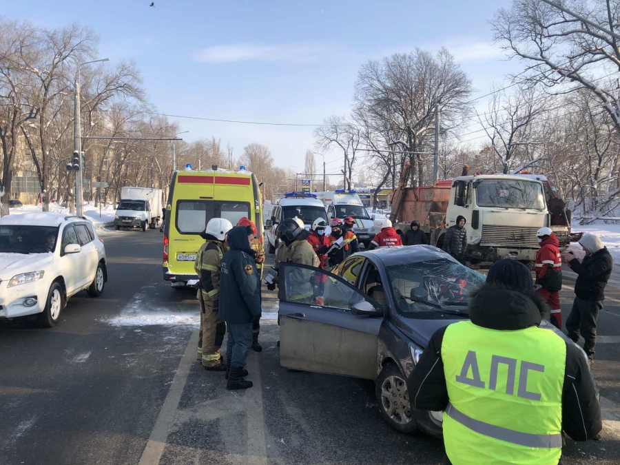 Возле Трофимовского моста иномарку искорежило в ДТП с мусоровозом