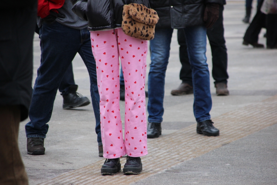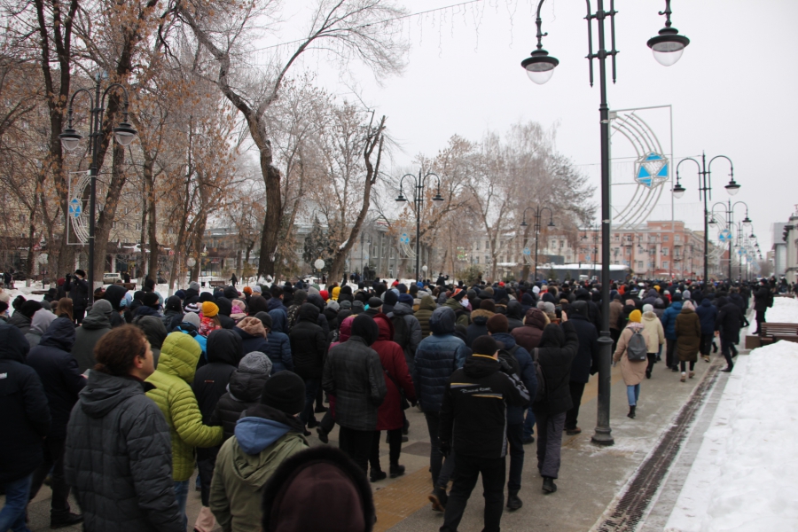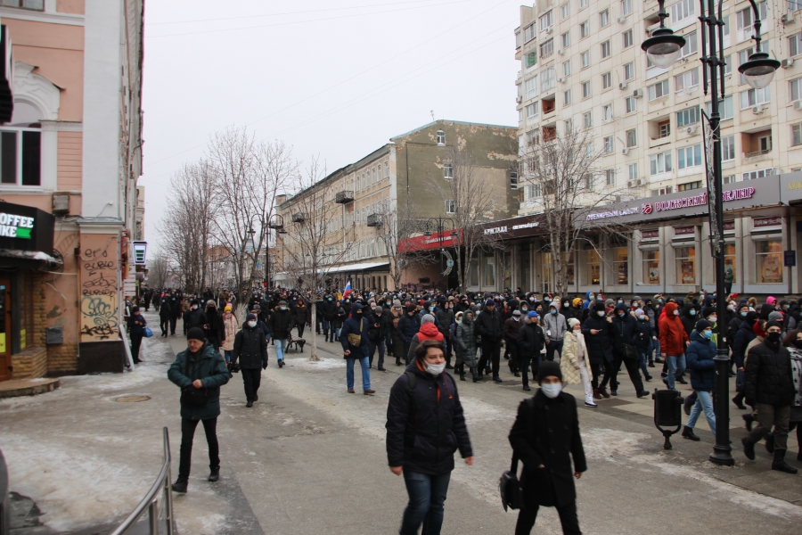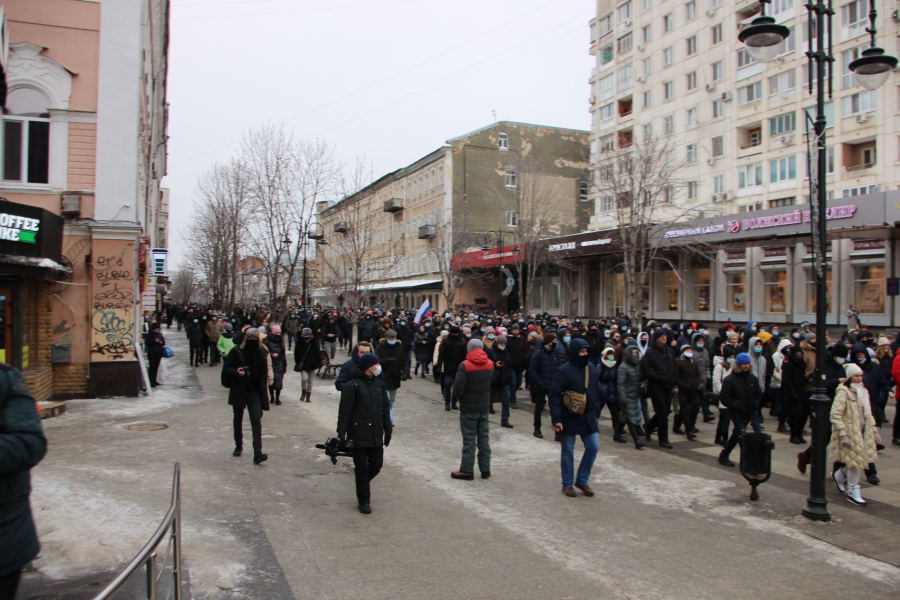 В 12:31 толпа после призывов к шествию двинулась в сторону проспекта Кирова. Редко звучат лозунги за Навального и против действующей власти, видно несколько флагов России.