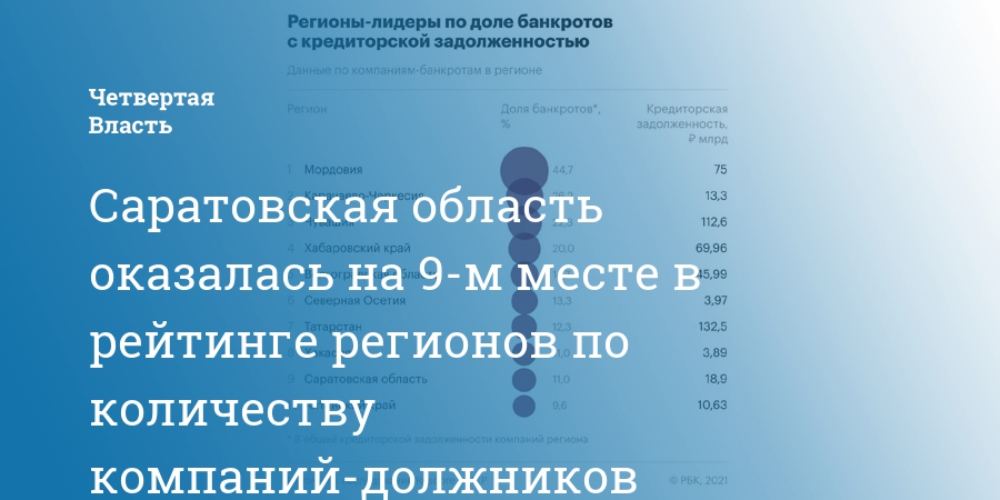 В Саратовской области доля банкротств достигла 11%, а суммарная кредиторская задолженность компаний-должников - 18,9 миллиардов. На первой строчке рейтинга - республика Мордовия. Там банкротятся 44,7% компаний, а сумма долга уже достигла 75 миллиардов. На 10 месте Алтайский край с 9,6% и 10,63 миллиарда соответственно.