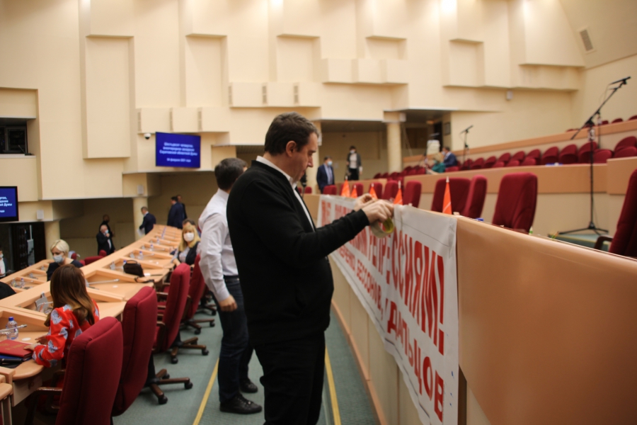 Председатель регионального парламента Александр Романов напомнил, что вход думу с транспарантами осуществляется только с разрешения председательствующего, а такого не было.