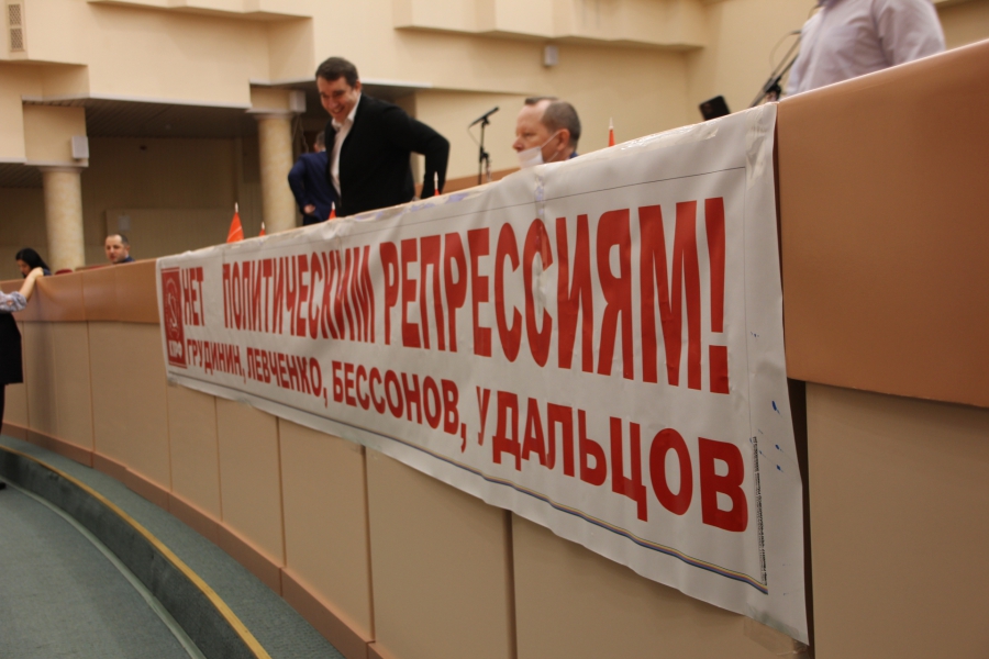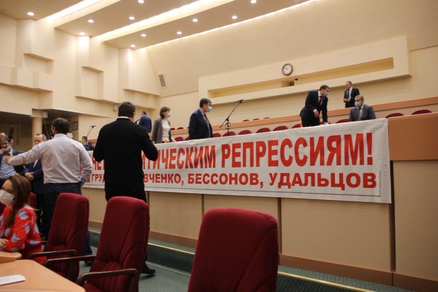 Перед началом заседания в думе произошел очередной скандал. Коммунисты принесли в зал заседаний транспарант, который прикрепили на свой ряд. По тексту плаката они выступили в поддержку своих коллег по левому движению в лице Сергея Грудинина, Сергея Левченко, Владимира Бессонова, Сергея Удальцова. На их примере члены КПРФ обвинили власти в политических репрессиях.