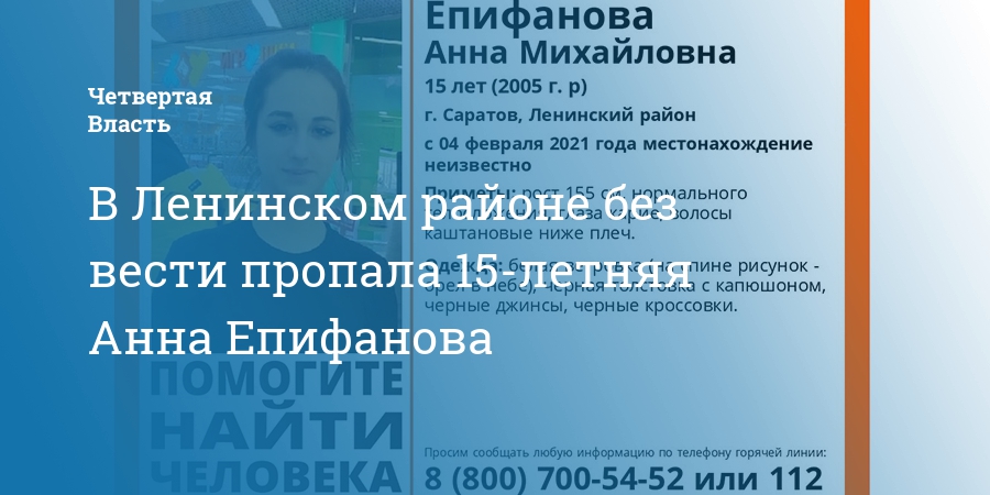 В Ленинском районе Саратова потерялась 15-летняя Анна Епифанова. Об этом сообщает поисковый отряд «Лиза Алерт».
