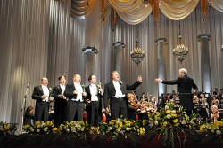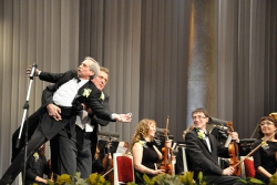 Затем пришел черед труппы. Бас, народный артист России Владимир Григорьев вынес на сцену запасного дирижера, который, по сценарию, сам плохо держался на ногах, потому что уже начал отмечать юбилей своего худрука. Затем на сцену вышли другие ведущие солисты с бокалами и Леонид Сметанников с бутылкой шампанского. Вино оказалось не бутафорским: пробка улетела в партер. В финале весь коллектив театра пропел Кочневу многия лета.