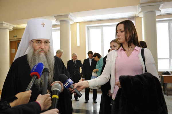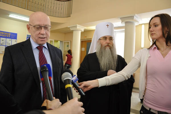 Перед встречей со студентами ректор СГУ Леонид Коссович и митрополит пообщались с прессой. Его преосвященству задали вопрос, какое чтение он как пастырь рекомендовал бы подрастающему поколению.