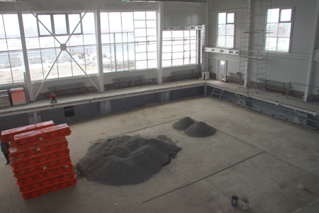 Генеральный директор ООО «Строитель» Александр Семин также признал определенные сложности на объекте: «При строительстве бассейна появилась проблема с грунтовыми водами, поэтому сейчас идут мероприятия, которые увеличивают срок строительства. Поэтому, к сожалению, сдача объекта в эксплуатацию перенесена на середину лета. Завершены все монтажные работы и огнезащитная обработка над чашей бассейна, завершаются отделочные работы на втором этаже. Продолжаются отделочные работы в подвале».