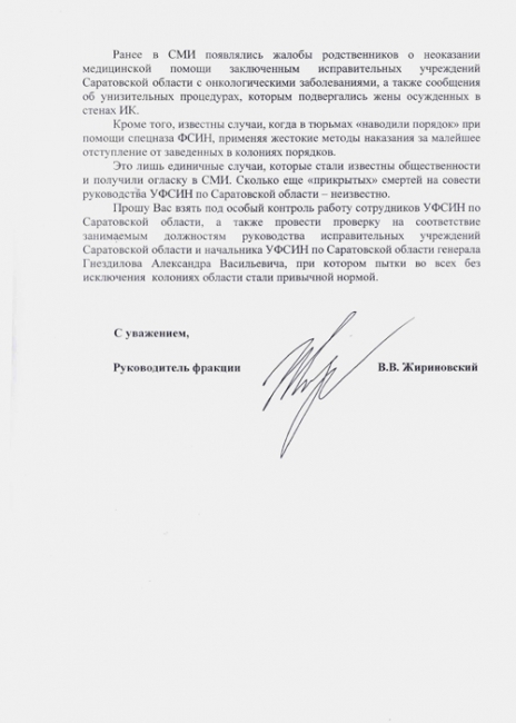 Сегодня лидер ЛДПР Владимир Жириновский обратился с письмом к директору ФСИН Российской Федерации Александру Реймеру с просьбой проверить, соответствует ли занимаемой должности глава Саратовского управления службы исполнения наказаний Александр Гнездилов.