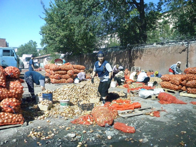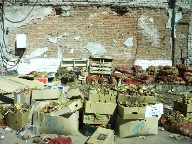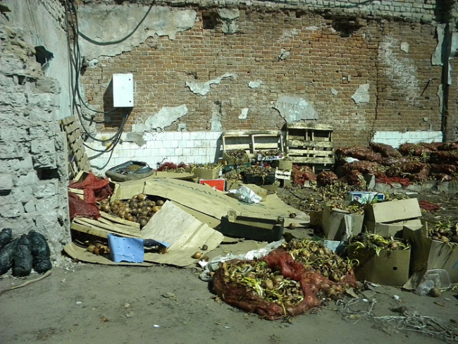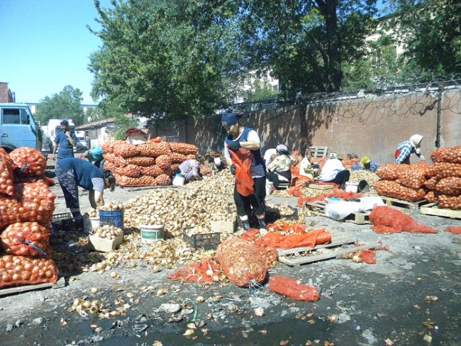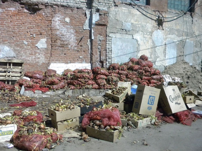 Корреспондент «Четвертой власти» побывал на рынке и убедился, что слова горожан полностью соответствуют ужасающей действительности. Первое, что по-настоящему начинаешь чувствовать, приближаясь к территории «Привоза» это зловонный запах, исходящий от протухшего лука, сотни килограммов которого уже больше недели «вялятся» на солнце. В нескольких десятках метрах от этой свалки трудятся женщины, которые прямо на дороге перебирают овощи. Возле них сотрудница азиатского кафе на отрытой площадке пытается приготовить плов, а неподалеку от точки общепита в это время идет бойкая торговля.