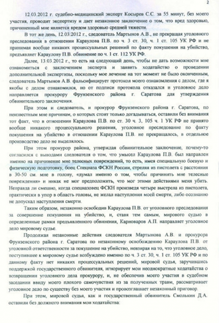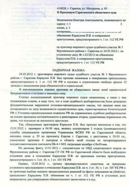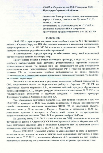 Сегодня экс-начальник охраны SV-кафе Виктор Федюшкин, которого в январе этого года расстрелял прапорщик УФСКН Павел Караулов, обратился с заявлением и надзорной жалобой к прокурору Саратовской области Владимиру Степанову.