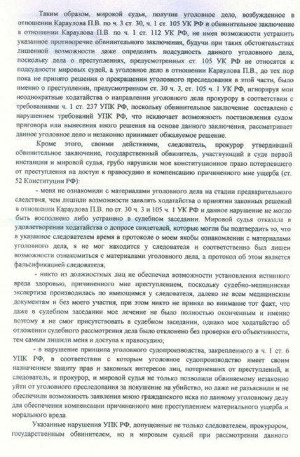 Потерпевший требует от главы надзорного органа пересмотра уголовного дела, в виду «фундаментальных нарушений» уголовно-процессуального закона допущенных во время судебного разбирательства. Это, по мнению бывшего охранника полностью лишило его прав гарантированных конституцией Российской Федерации на должную и беспристрастную защиту от полицейского произвола.