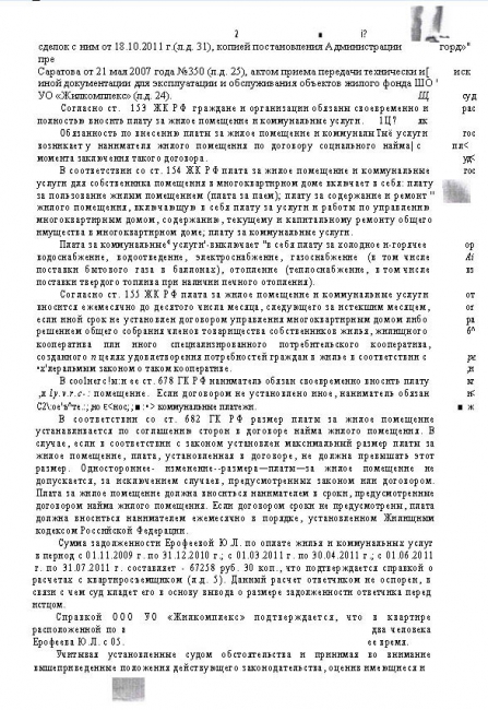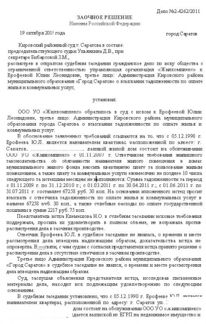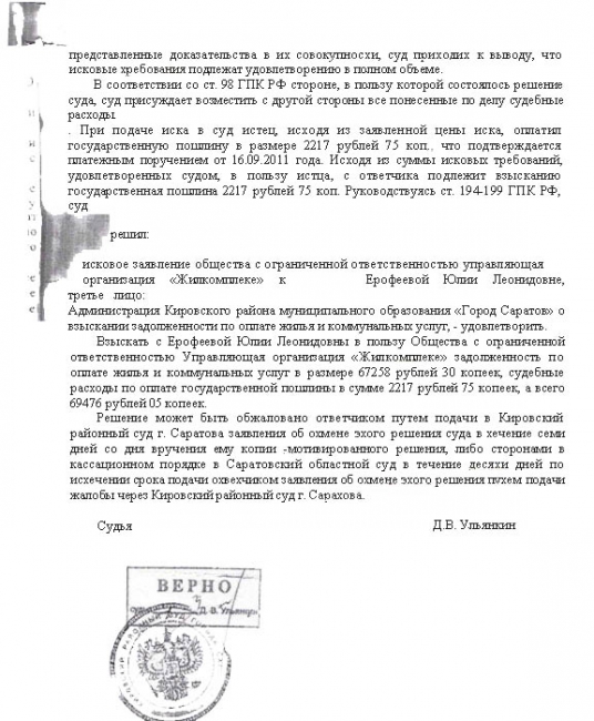 В связи с этим, судья приняла заочное решение, встав на сторону истца. За неуплату в период с 01.11.2009 по 31.12.2010, с 01.03.2011 по 30.04.2011; с 01.06.2011 по 31.07.2011, судья Кировского районного суда Ульянкин постановил взыскать с Ерофеевой сумму долга в размере 67 258 рублей 30 копеек, и погасить расходы по оплате госпошлины 2217 рублей 75 копеек. Общая сумма не оспоренного долга омбудсмена тогда составляла 69 476 рублей 05 копеек.