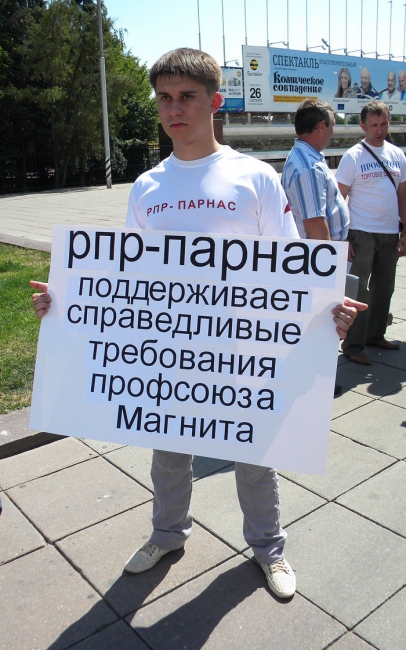 «Сегодня третий по счету пикет. Первый был после истории с патронами, второй пикет после того, как мы не смогли добиться справедливости в прокуратуре и суде. Тогда судья Савинова Н. В. вынесла вердикт о переносе рассмотрения дела в первомайский суд города Краснодара. Сейчас мы подали частную жалобу в областной суд, пытаемся доказать неверное решение предыдущей инстанции. Суть нашего искового заявления в том, что руководство «Магнита» игнорирует законное требование своих сотрудников о выделении помещения для работы профсоюза, численность которого составляла более 40 человек», - отметил лидер ячейки. Сейчас, по его словам, под давлением руководства профсоюз покинуло много его постоянных членов.