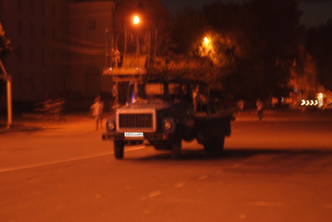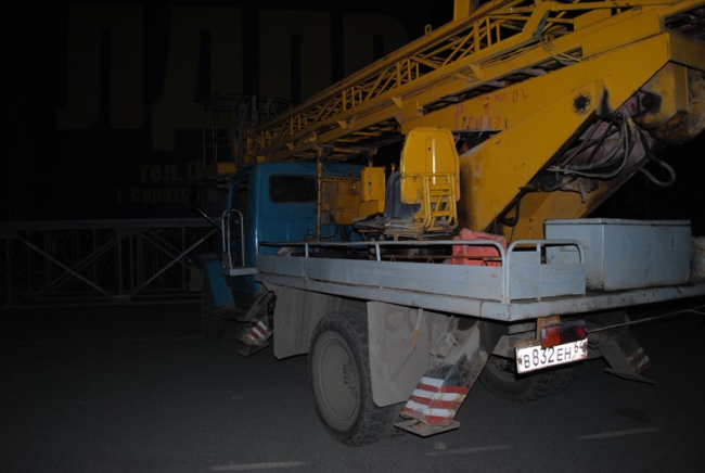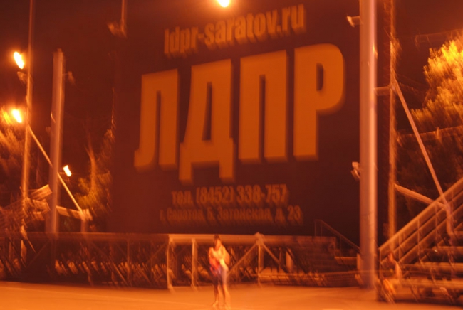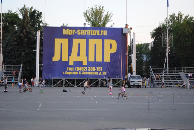 Вчера ночью группа неизвестных пыталась демонтировать рекламный баннер партии ЛДПР, установленный на Театральной площади Саратова. По сведениям очевидцев, ровно в 23.00 неожиданно для всех квартал в центре города остался без света. Из-за отключения сети перестал мигать даже большой экран на территории регионального правительства. В этот момент, к главной сцене областного центра подъехал автомобиль-вышка «Горсвет» и легковушка. Несколько крепких мужчин попытались подняться на сцену над которой весит реклама, но дорогу им преградили активисты либерал-демократической партии, общественник Вячеслав Шаронов и группа быстрого реагирования одного из ЧОП.