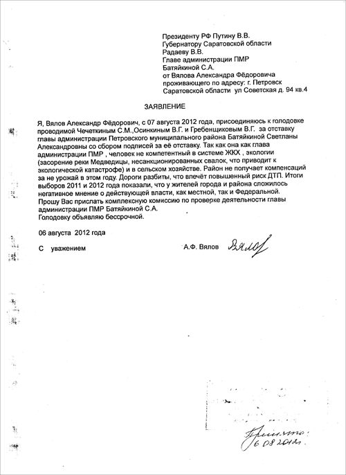К бессрочной голодовке в Петровске Саратовской области присоединяется еще один, четвертый участник. Им стал местный казак и безработный Александр Вялов. Он пояснил корреспонденту «Четвертой власти», что полностью поддерживает экс-депутатов Виктора Осинкина и Сергея Чечеткина, а также Вениамина Гребенщикова в их требовании отправить в отставку главу райадминистрации Светлану Батяйкину.