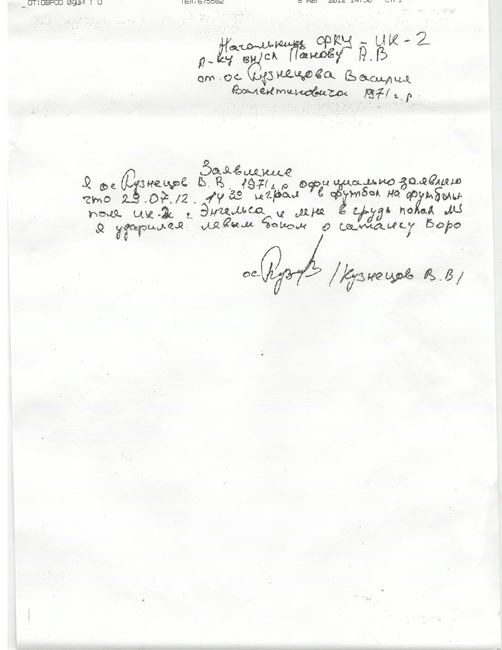 Из текста заявления следует что, заключенный и в самом деле травмировался, играя в футбол на поле «ИК-2». «Мне в грудь попал мяч. Я ударился левым боком о штангу ворот», - пишет заключенный Кузнецов.