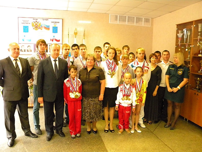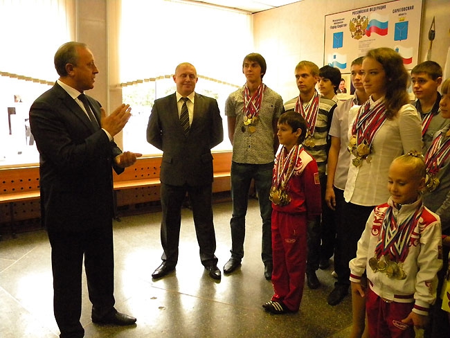 1 сентября губернатор Валерий Радаев посетил среднюю школу № 45 в Саратове. В рамках визита главу региона познакомили со школьными достижениями. Оказалось, среди учеников средней школы есть немало выдающихся спортсменов, в том числе призёр всероссийского турнира, чемпионка области по художественной гимнастике, мастер спорта Светлана Голохвастова, многократная победительница международных и всероссийских соревнований по художественной гимнастике Софья Шитова, двукратный чемпион России по карате Илья Филатов.