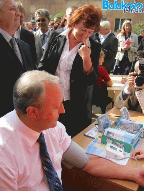 На «островке здоровья» ему измерили давление, показали медицинских пиявок и угостили кислородным коктейлем. Председатель комитета здравоохранения Балаковского района Ольга Емельяненко поочередно подвела Валерия Радаева к столам нескольких специалистов, среди которых были психиатр и венеролог. Заботливые медики дали главе региона несколько рекомендаций, как сохранить здоровье, и подарили средство контрацепции и предотвращения инфекций, передающихся половым путем, вместе с раствором антисептика.