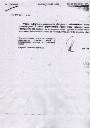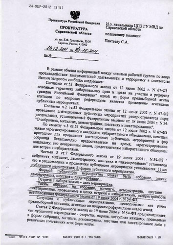 Письмо из прокуратуры было написано в ответ на запрос руководителя центра по противодействию экстремизму ГУ МВД Сергея Пантеева о законности проведения митингов в форме встреч с избирателями. Согласно документу из прокуратуры, встреча с избирателем является целью публичного мероприятия, а не его формой, которая может быть в виде собрания, митинга, демонстрации или пикетирования.