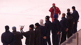 Процедура могла бы получиться пресной, если б не лидер саратовских фанатов Сергей Шамиев. После того, как заслуженный тренер России Александр Подметалин передал капитану "Универсала" Сергею Козлову Кубок Федерации хоккея с мячом России (впервые в истории выигранный саратовцами), он взял микрофон. Торжественная речь, восхваляющая талант и самоотдачу игроков, завершилась земным поклоном, после чего Шамиев пригласил болельщиков на стадион "Динамо":