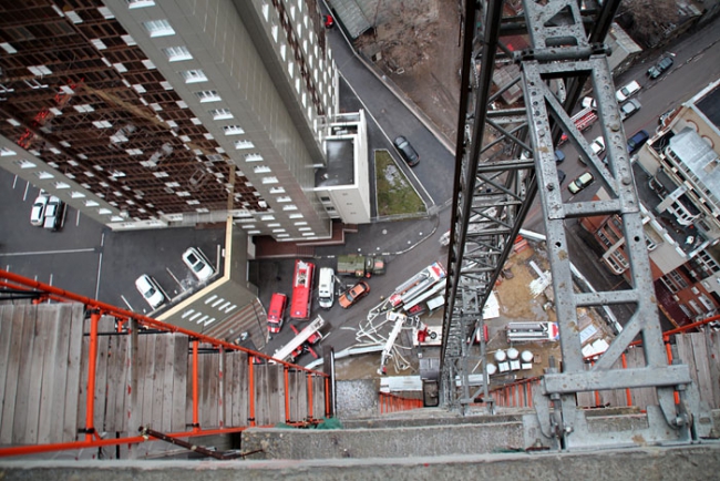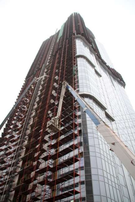 В завершении учений всем журналистам удалось посетить высотку, куда корреспондентов доставили с помощью внешнего лифта.