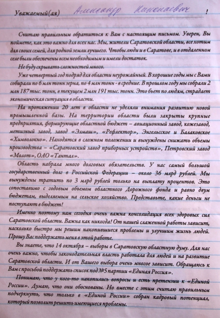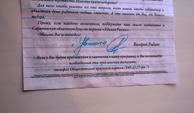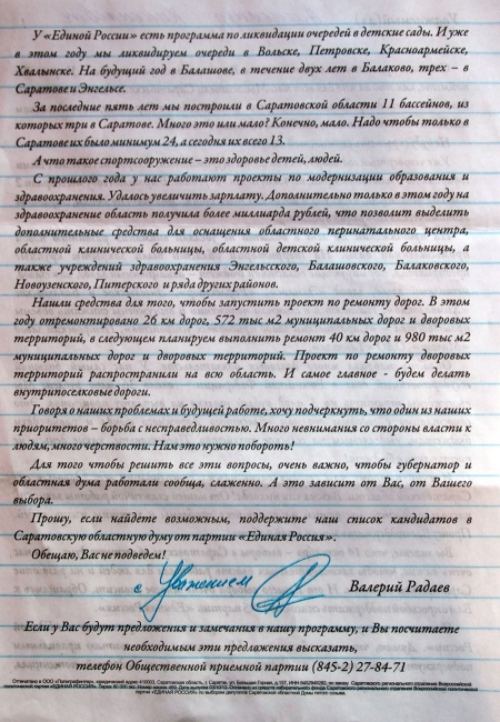 По мнению Александра Николаевича, целью злоумышленников было оказание влияния на потенциальных избирателей в канун областных выборов. Для этого разослали по адресам жителей областного центра конверты с агитлистовками от имени Валерия Радаева. Подобное послание пришло и ему лично. Общественник отмечает, что неучтенные конверты без марок распространялись якобы через филиалы «Почты России». Тем самым бюджету компании мог быть нанесен крупный ущерб.