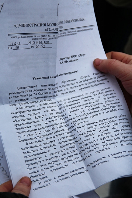 По словам председателя совета предпринимателей рынка «Дар» Татьяны Киреевой, еще в середине декабря ей лично сообщила о будущем рынка заместитель главы администрации Саратова по экономическим вопросам Елена Ножечкина. На месте рынка планируется возвести газон, и предпринимателям категорично рекомендовалось покинуть территорию.