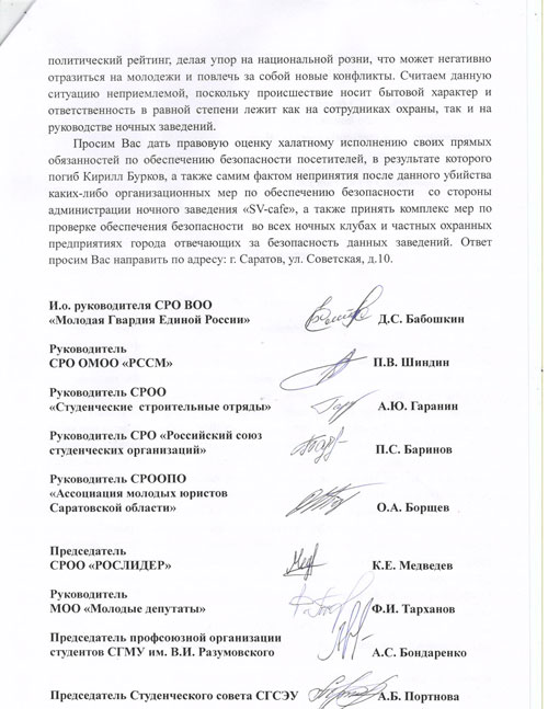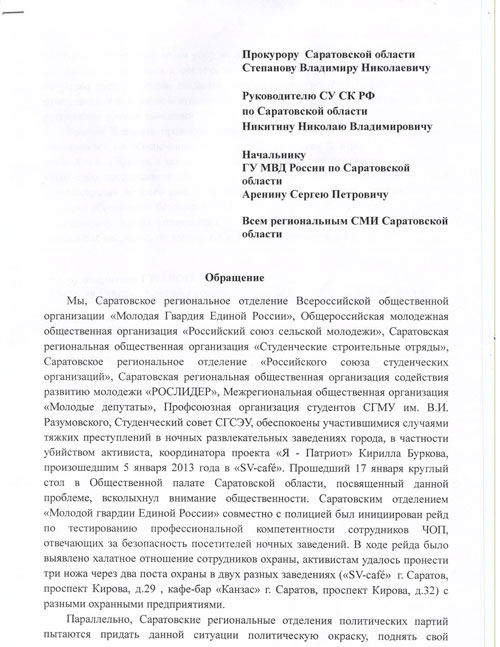 Представители молодежных организаций в Саратовской области написали обращение прокурору региона Владимиру Степанову, руководителю СУ СКР Николаю Никитину и начальнику ГУ МВД Сергею Аренину. В письме молодежь просит обратить внимание на безопасность в ночных заведениях, опасаясь новых конфликтов после убийства Кирилла Буркова в «SV-cafe».