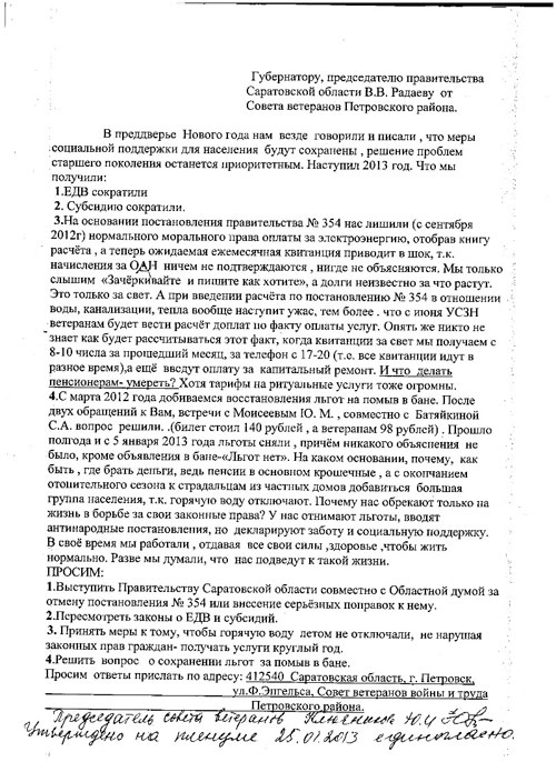 1. Выступить правительству Саратовской области совместно с областной думой за отмену постановления №354 или внесение серьезных поправок к нему;