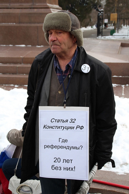 Сегодня состоялась акция оппозиционного движения «Стратегия 31» в защиту одноименной статьи Конституции, гарантирующей свободу граждан собираться мирно. Оно началось ровно в полдень у памятника Чернышевскому в Саратове, и продлилось почти час. За это время 8 участников акции рассказали собравшимся о неудовлетворительной, по их мнению, работе главного федерального инспектора области Марины Алешиной в надзоре за правоохранительными органами, вспомнили политических заключенных и заявили об участившихся случаях давления на оппозиционных демонстрантов. Среди граждан с плакатами замечены общественники Григорий Ахтырко, Михаил Наместников, Борис Залкинд, и Алексей Битюцкий.