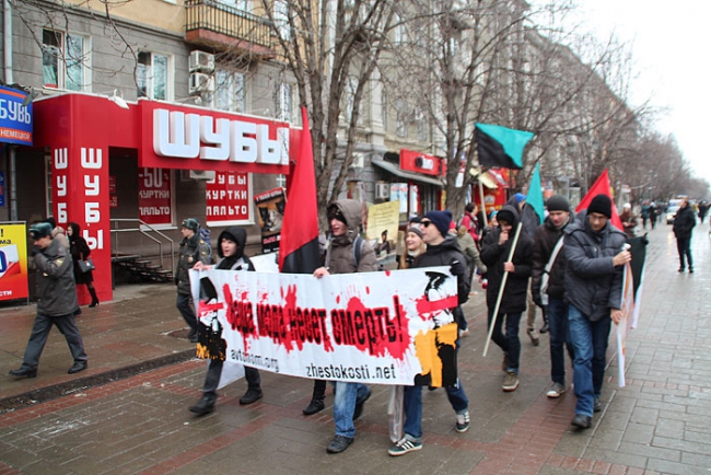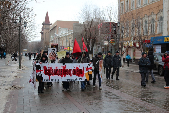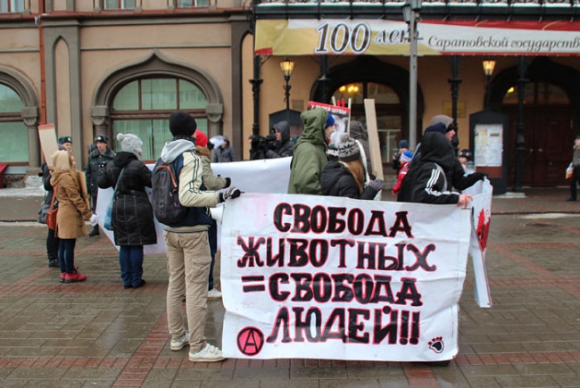 В минувшее воскресение в центре Саратова состоялась акция эко-анархистов «АнтиМех». Ровно в 15:00 чуть больше десятка молодых людей собрались у фонтана напротив Консерватории. Растянув плакаты, с надписями: «Ваша мода несет смерть», «Животные - не одежда», «У твоей шубы было лицо», и «Носишь мех ради статуса? Твой статус дикарь!», протестующие провели шествие через весь проспект Кирова. Во время движения любители животных скандировали различные лозунги: «Купил мех - убил животное», «Покупать одежду из меха уже не нужно», и др.