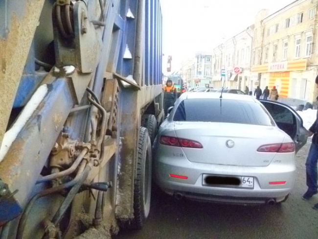 Только что в центре Саратова на улице Московской (между Мичурина и Чернышевского) произошла авария. Как сообщают очевидцы случившегося, столкнулись мусоровоз «СпецАТХ» и автомобиль «Альфа Ромео».