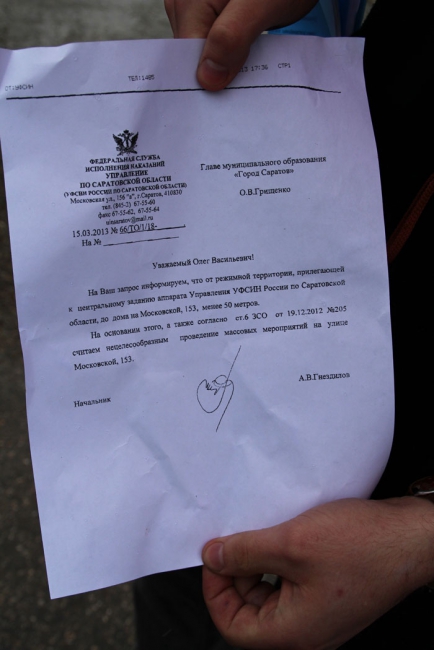 «На Ваш запрос информируем, что от режимной территории, прилегающей к центральному зданию аппарата управления ФСИН России по Саратовской области до дома на Московской, 153, менее 50 метров. На основании этого, а также согласно ст. 6 ЗСО от 19.122012 №205 считаем нецелесообразным проведение массовых мероприятий на улице Московской, 153», - говорится в документе, который УФСИН адресовал главе Саратова Олегу Грищенко.