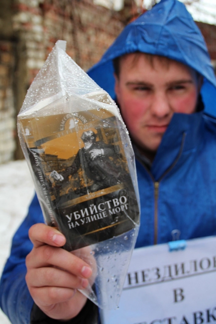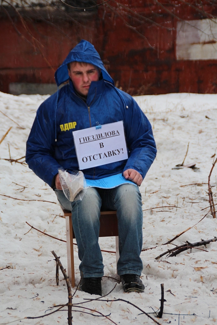 Примерно в 14.00 молодой человек расположился в 50 метрах от центрального входа в режимное учреждение (ул. Московская, д.156 «А»). Сев на стул, он надел на себя табличку «Гнездилова в отставку!», в руках либерал-демократ держал книгу Эдгара Алана По «Убийца на улице Морг» и закон Саратовской области о проведении публичных мероприятий.