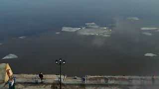 На Волге в районе Набережной Космонавтов начался ледоход. Вода около причальной стенки растаяла, и по реке движутся небольшие льдины. Вместе с ними вдоль берега движутся и большие желто-бурые пятна неизвестного происхождения, местами сплошным потоком.
