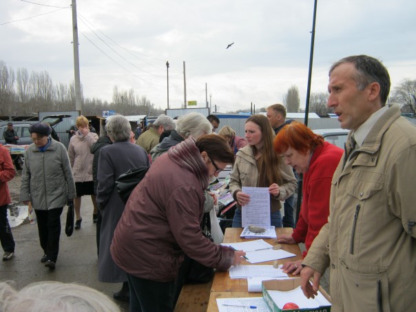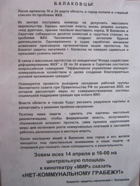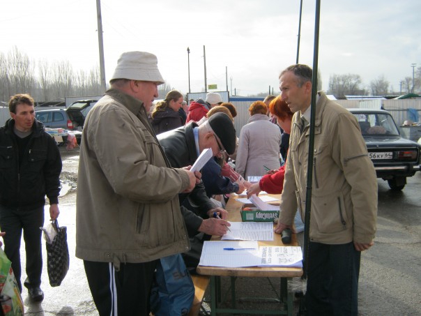 В минувшие выходные на площади в Балакове Саратовской области у входа на городской сельскохозяйственный рынок коммунисты провели двойную акцию. Представители КПРФ собрали подписи под требованиями жителей Балакова, изложенными в резолюции на акции протеста 24 марта, посвященной беспределу в сфере ЖКХ.