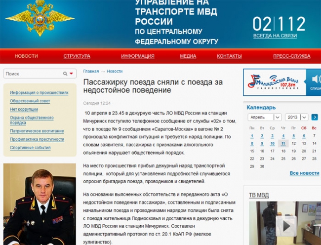 «10 апреля в 23.45 в дежурную часть ЛО МВД России на станции Мичуринск поступило телефонное сообщение от службы «02» о том, что в поезде № 9 сообщением «Саратов-Москва» в вагоне № 2 произошла конфликтная ситуация и требуется наряд полиции. По словам заявителя, пассажирка с признаками алкогольного опьянения нарушает общественный порядок.