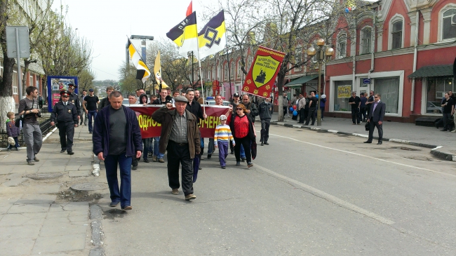 Когда же активисты обеих сторон пришли в назначенное время на место сбора, то были неприятно удивлены, увидев с кем им предстоит идти в колонне. Напряженность резко возросла по мере приближения к конечной точке маршрута. Следуя по Московской, представители леворадикальных движений начали скандировать: "Фашизм не пройдет; руки рабочих разного цвета, руки рабочих держат планету; националисты всегда сзади". При последней фразе представители национал-патриотических движений, которые шли в конце колонны, на некотором отдалении от "левых соратников" начали скандировать в ответ: "Русские вперед, России - русскую власть". Правда вышло это у них намного тише и слабее, нежели у их идеологических врагов. В итоге на шествии началась настоящая "перепалка" лозунгами между сторонами, которое едва не переросло в настоящий конфликт.