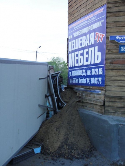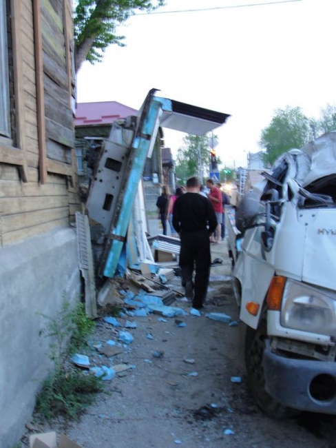 Отмечено, что грузовик снес ограждение и протаранил угол дома, в котором проживает одинокая женщина-инвалид. В результате аварии автомобиль получил серьезные повреждения: смялась кабина и снесло кузов, при этом в стене дома образовалась дыра.