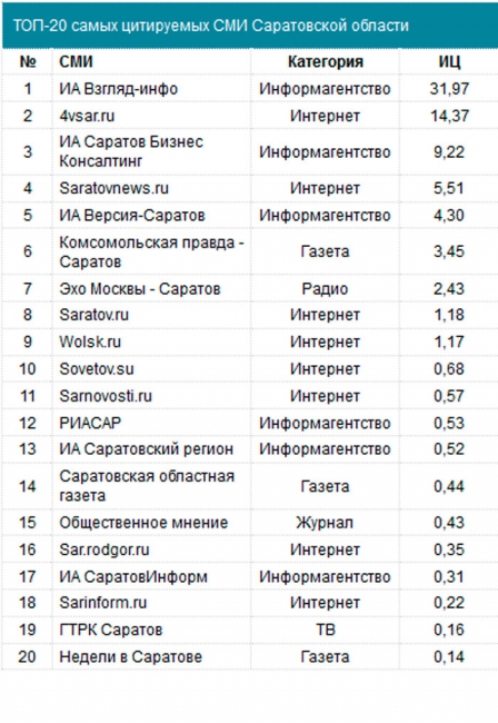 Первое место в рейтинге заняло ИА «Взгляд-инфо» - (ИЦ - 31,97 п.), затем идут «Четвертая власть» - (14,37 п.) и ИА «Саратов Бизнес Консалтинг» - 9,22 п.