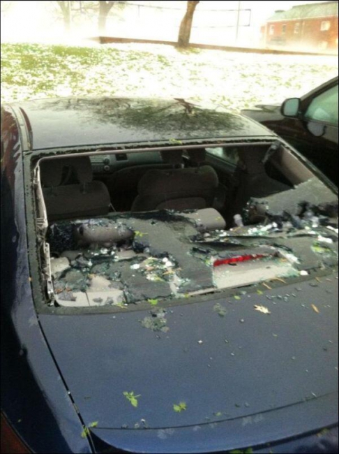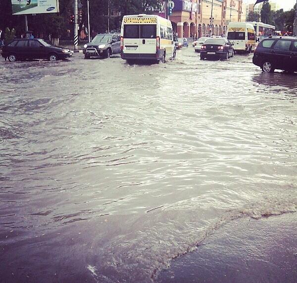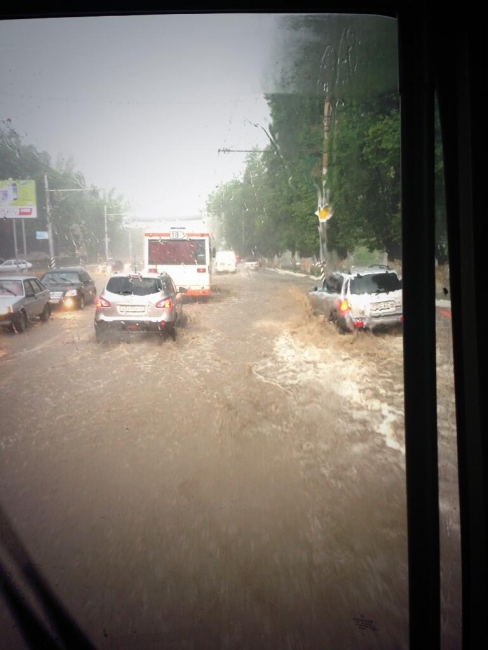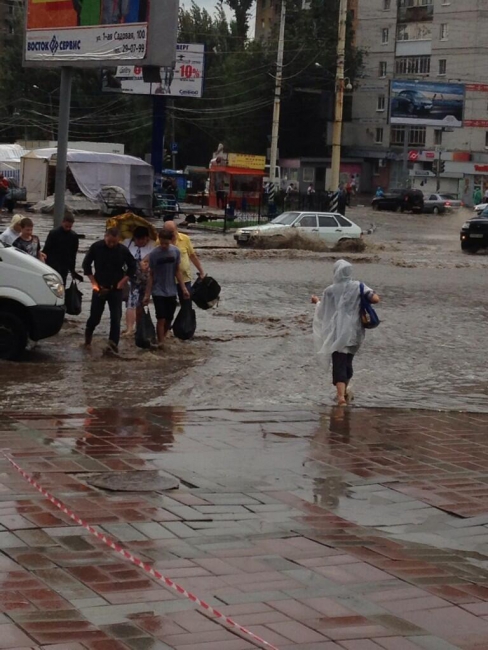 Сегодня Саратов вновь оказался затоплен в результате сильного дождя. На этот раз ливень сопровождался крупным градом, который, по свидетельству очевидцев, повредил несколько автомобилей.