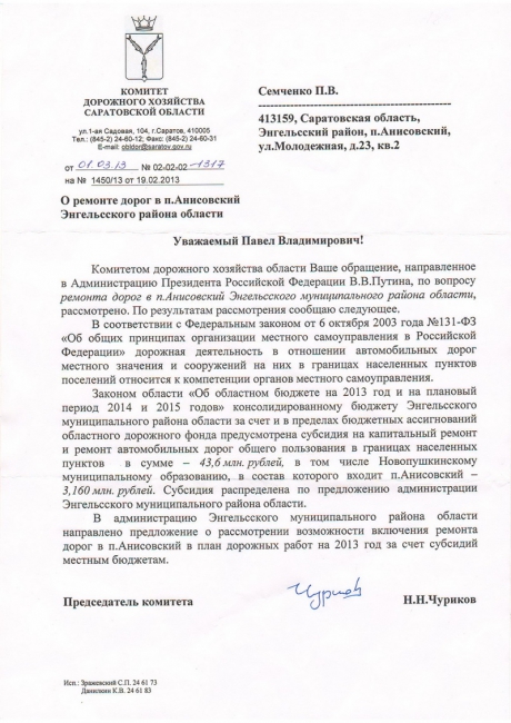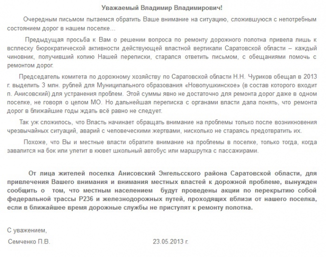 Жители поселка Анисовский Энгельсского района готовы перекрыть федеральную трассу Р-236 (идет от Саратова через Энгельс, Ершов, Озинки до границы с Казахстаном), если власти не приступят к ремонту поселковой дороги. Как сообщил «Четвертой власти» местный активист Павел Семченко, в мае отчаявшиеся граждане написали письмо президенту страны Владимиру Путину, однако местные чиновники продолжают бездействовать.