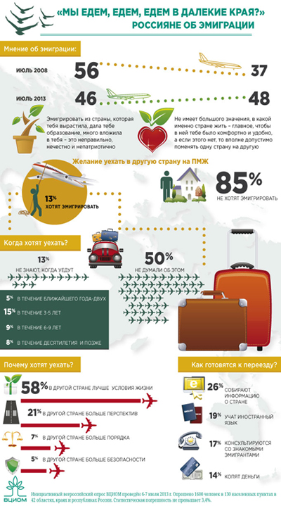 Всероссийский центр изучения общественного мнения (ВЦИОМ) провел опрос населения об отношении к эмиграции, желаниях уехать из страны и причины этого. Как выяснилось, наибольшую часть желающих эмигрировать составляет молодежь.