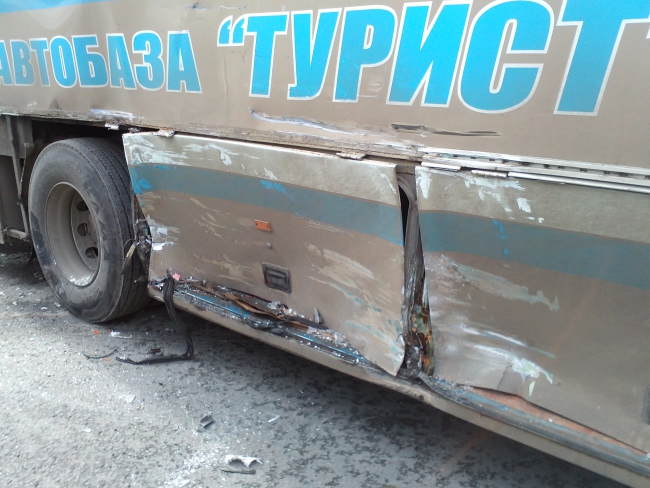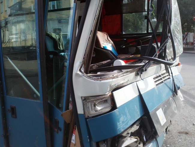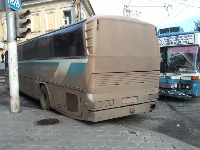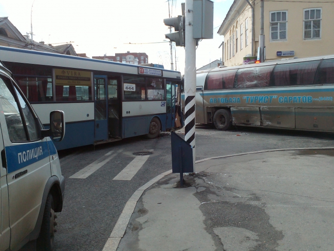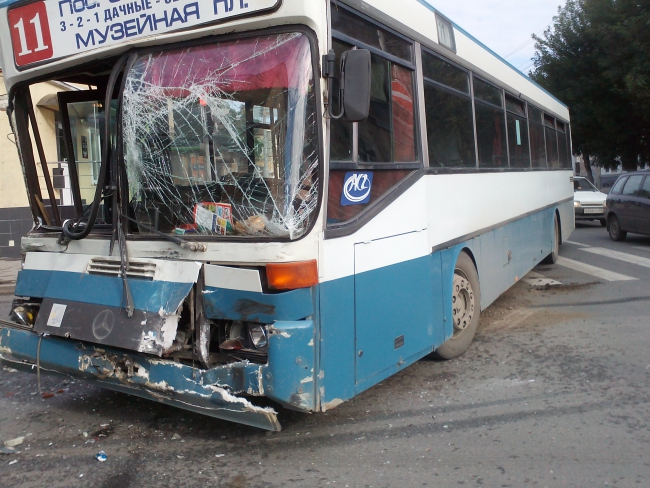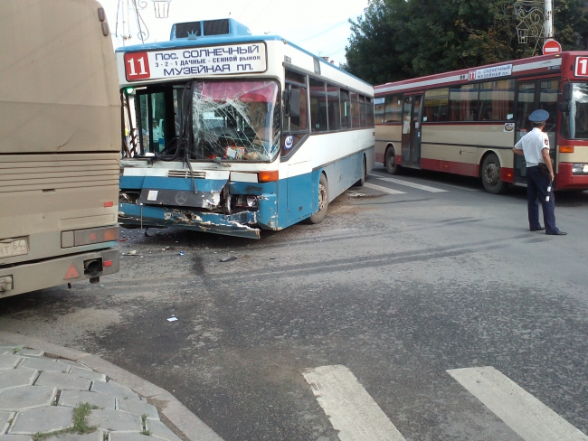 По предварительной информации, автобус «Мерседес» 11-го маршрута ехал по Московской в сторону Волги, а на перекрестке с Мичурина вразрез ему поехал туристический автобус «Неоплан». В результате наиболее серьезно пострадал 11-й: разбились лобовые стекла, помята передняя часть, в том числе и двери. У второго участника ДТП повреждена правая боковая часть, а также стекло.