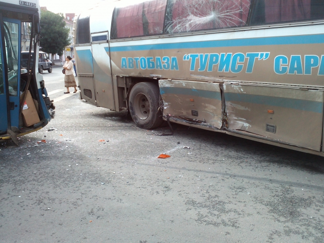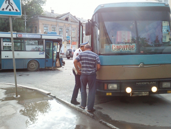 Сегодня утром на улице Московской в Волжском районе Саратова произошло столкновение двух автобусов.