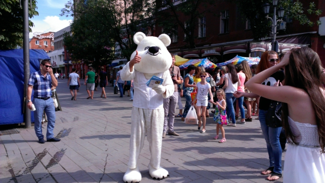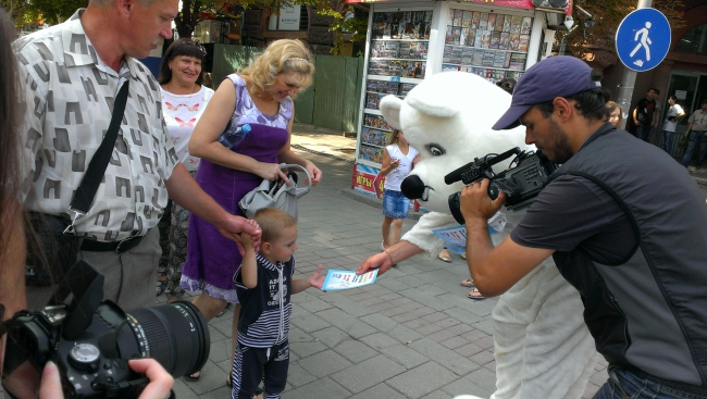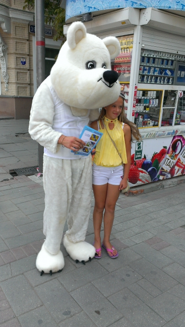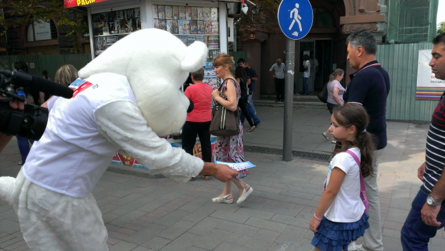 Сегодня на проспекте Кирова ростовая кукла медведя раздавала детям листовки с правилами перехода через проезжую часть. Акция была реализована активистом «Молодой гвардии».