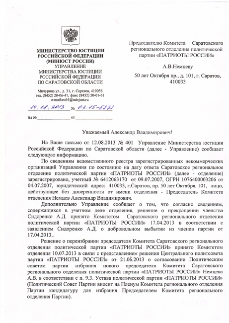 Как следует из сообщения господина Немцева, бывший лидер саратовских «Патриотов» Сидоренко выбыл из членов партии 17 апреля этого года «на основании личного заявления о добровольном выбытии из членов партии». Также новый председатель проинформировал, что в соответствии с действующим законодательством, а также уставом партии, после проведения пленума комитета и избрании нового председателя, 15 июля документы о внесении изменений были направлены в Управление Минюста. Для подтверждения своих слов Александр Немцев предоставил копии писем из Минюста.