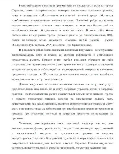 Александр Ландо обратил внимание, что нарушения носят массовый характер. Поэтому он сделал вывод, что отсутствует плановый и своевременный контроль за деятельностью рынков со стороны контролирующего органа - Роспотребнадзора.