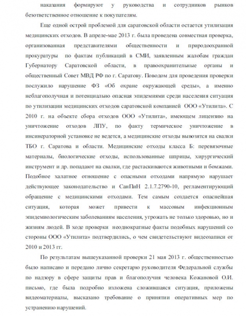 «Существующую ситуацию считаю недопустимой и требующей немедленного вмешательства. Настоятельно прошу Вас разобраться в причинах такого халатного отношения со стороны должностных лиц, дать оценку той профилактической и контролирующей деятельности, которую осуществляет Управление Федеральной службы по надзору в сфере защиты прав потребителей и благополучия человека в городе Саратове и оказать содействие в рассмотрении и устранении фактов нарушения законодательства», - обратился Александр Соломонович.