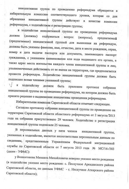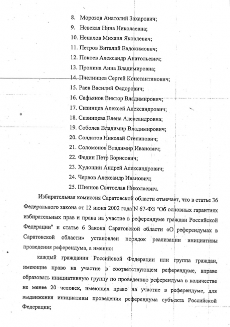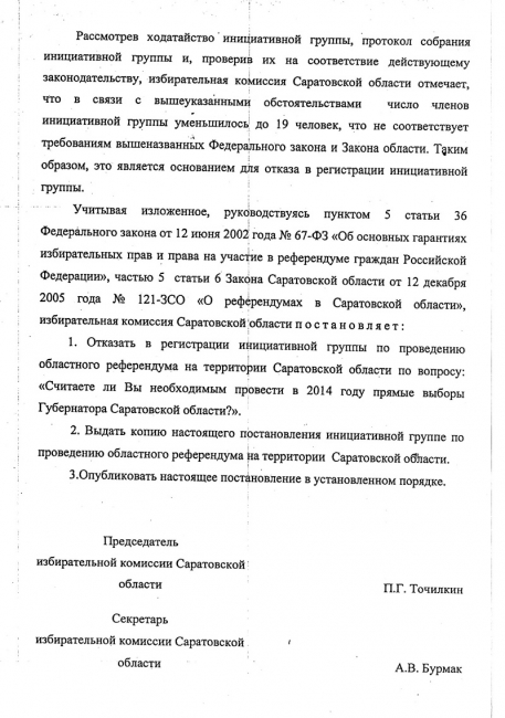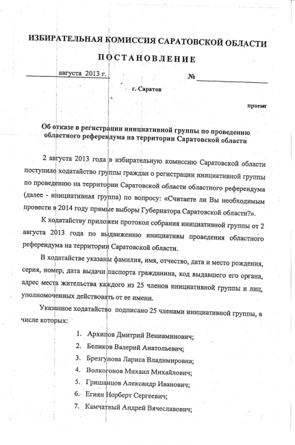 Жители Саратовской области подали в избирательную комиссию региона документы на проведение референдума по выборам губернатора. Однако вчера избирком отказал в регистрации данной инициативной группы в составе 25 человек.