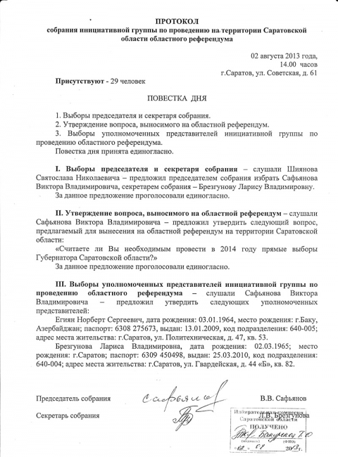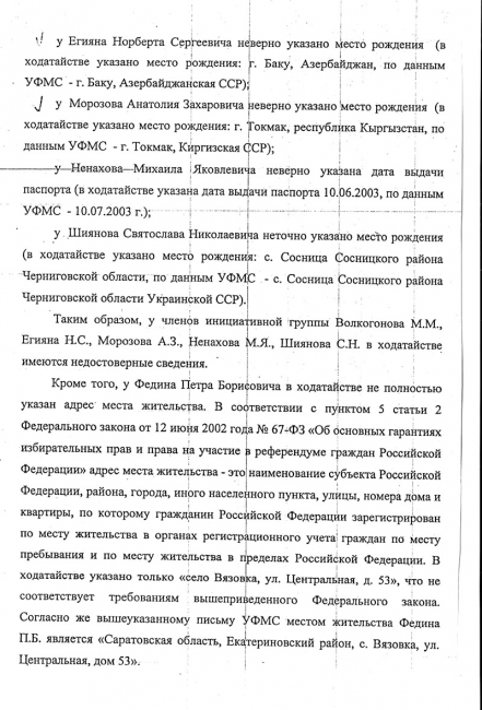 Причиной для отказа стали якобы противоречащие данным УФМС паспортные сведения пяти человек. Еще один участник группы не полностью указал место жительства. Таким образом, в инициативной группе осталось 19 человек, что меньше положенных для регистрации 20.